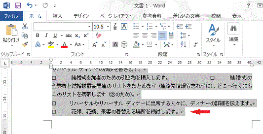 (2)削除ページの文末を、Shiftキーを押しながらクリックします。 これでページ全体が選択できます。
